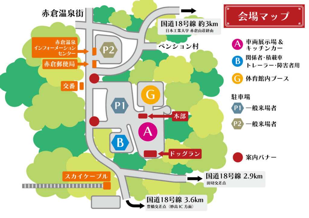 カーナビやGoogleマップなどの地図アプリを使って来場される場合は、「赤倉温泉スキー場 第一駐車場」を目的地にするか、その横に併設する「赤倉体育センター」、または会場のすぐ横にある「赤倉温泉観光協会」を目的地にしてお越しください。